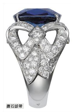 花環時代重要的蝴蝶結象徵,Cartier將其運用在Elena鑽石戒指的側邊設計上,呈現出如建築般的宏偉氣勢,圓弧的線條仍不失蝴蝶結的柔美,也讓鑽石蝴蝶結靈活而不僵硬。從側面看,更有花環風格無盡延伸的線條感,是現代詮釋花環風格的傑作。