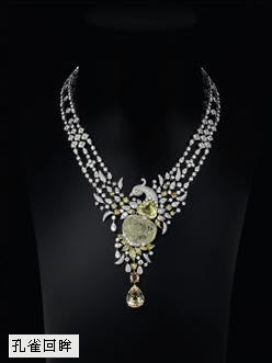 以54.89克拉的雕刻黃色剛玉為主體,點出孔雀的異國風情,搭配1顆心型車工與6顆馬眼型車工的黃色剛玉,對比明亮與清透展現立體感。