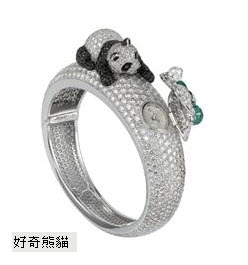 掀開草葉,原來是時間動個不停。Cartier以白鑽與黑色剛玉密密鑲嵌出栩栩如生的熊貓毛色,手鐲與草葉上也鑲滿小鑽,幾乎不見鑲爪,展現Cartier細膩的鑲嵌工藝。