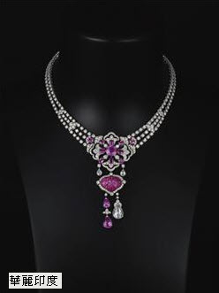 印度風情是Cartier近年頂級珠寶的重要主題,中央鑲嵌一顆珍珠的幾何菱形鍊墜下墜鑽石流蘇,細看還有3種鑲嵌方式,鑽石亦向下漸小,呈現出豐富層次的折射光芒。最引人的莫過於6顆令人垂涎欲滴的紅寶石,來自塔吉克與緬甸,最大的一顆重22.72克拉。