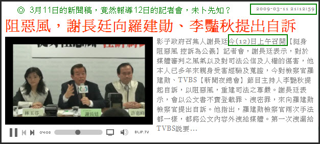 謝長廷對檢察官羅建勛、TVBS【新聞夜總會】節目主持人李艷秋提起自訴 謝長廷記者會 20090312 影子政府召集人謝長廷今(12)日上午召開【挺身阻惡風 控訴為公義】記者會,謝長廷表示,對於媒體審判之風氣以及對司法公信及人權的傷害。 當司法不公對阿扁進行追殺時,民進黨的天王個個惜字如金,謝長廷更是叫阿扁閉嘴、好好面對司法。如今當謝長廷指控檢察官羅建勛和媒體人李豔秋時,謝長廷也想到公義,跳出來向羅建勛和李豔秋提自訴。 在此呼籲台灣人勿做選擇性的公義,當司法不公時要即時站出來發聲。謝長廷要「阻惡風、 為公義」,生為台灣人應該沒有人會反對才是。