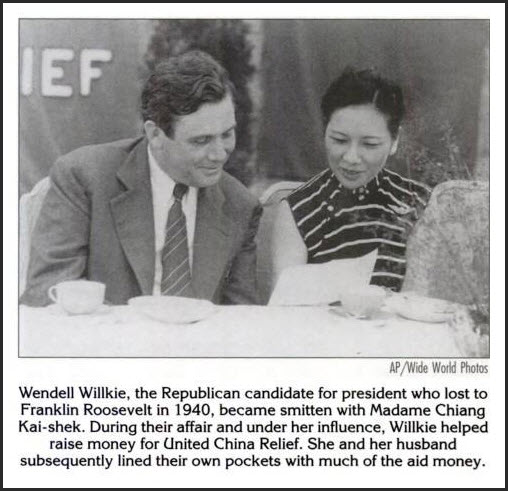 Next, she said Cowles should spend whatever was needed to secure the Republican presidential nomination for Willkie. "She would reimburse me for all expenditures," he added in his memoir. The cash would, presumably, have come from US loans to China sitting in American bank accounts.