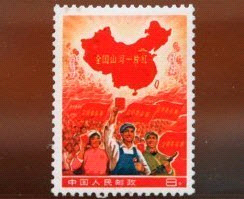 此郵票的年代不到五十年, 到底有何稀奇﹖原來此是以紅色中國地圖為主加上三個代表農工兵中國人民拿著紅色毛語錄的郵票﹕