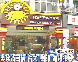 行政院長吳敦義還在忙著慰留衛生署長楊志良,但他的醫生女婿林泰成,卻給他惹了一個小麻煩!媒體踢爆,林泰成新開幕的耳鼻喉科診所,外頭的醫師簡介,竟然自稱是「台大醫院耳鼻喉部醫師」,但經過查證,林泰成只曾經參加過台大1、2個月的訓練過而已,從頭到尾,沒有受聘擔任主治或住院醫師,根本就稱不上是台大醫師,這麼寫用來招攬病患,其實也違反開業醫師的行規,遭到披露之後,記者再次登門,林泰成的簡介,已經悄悄改成了「台大醫院耳鼻喉部訓練醫師」。