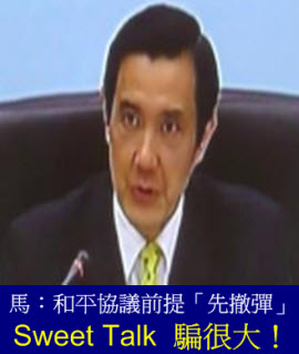 面對大陸的武力威脅,馬英九說,我們也要求中國大陸必須撤移或拆除目前瞄準台灣的飛彈,否則台灣不會對與大陸談判和平協議採取進一步的行動」。