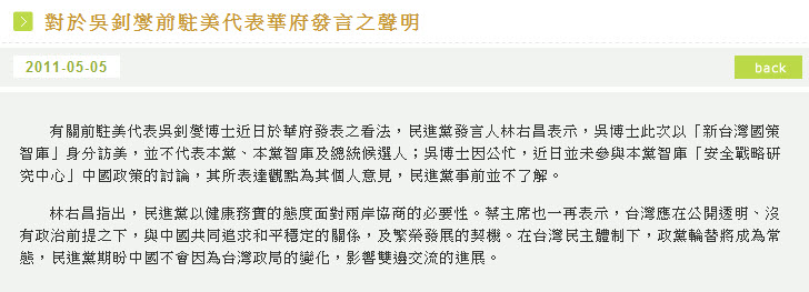 民進黨5日上午發布新聞稿表示:有關前駐美代表吳釗燮博士近日於華府發表之看法,民進黨發言人林右昌表示,吳博士此次以「新台灣國策智庫」身分訪美,並不代表本黨、本黨智庫及總統候選人;吳博士因公忙,近日並未參與本黨智庫「安全戰略研究中心」中國政策的討論,其所表達觀點為其個人意見,民進黨事前並不了解。