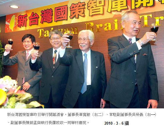 「新台灣國策智庫」由辜寬敏贊助成立,2011年3月5日舉行揭幕茶會。辜寬敏致詞時強調,智庫是要為民進黨二○一二年重掌執政做準備,包括端出政策與累積人才,讓未來的本土政權更穩定。
