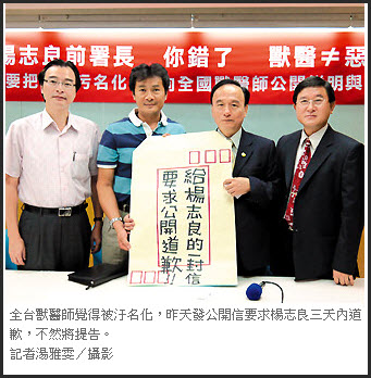 衛生署前署長楊志良新書「拚公義,沒有好走的路」裡,以「獸醫」形容沒醫德的醫師。這讓全台五千名獸醫動怒了,不僅在臉書上串連抗議,昨更舉行記者會,要求楊三天內公開道歉,否則以加重誹謗罪提告。