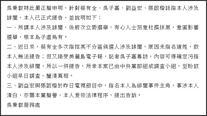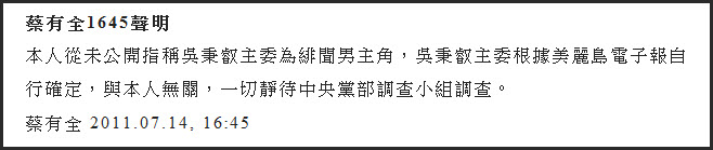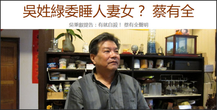 蔡有全表示,過去一段時間,因為太太周慧瑛有意角逐三重區立委,所以經常有機會與地方人士接觸以了解選情。當時,當地也傳出一位「吳姓前立委」也正尋求前往三重參選的可能,沒想到當地人士對於這位「吳姓前立委」幾乎都是嗤之以鼻,且理由竟然都不約而同的指向這個人有「性醜聞」。