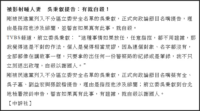 民進黨不分區立委名單,驚爆一位男性被提名人,不僅「睡支持者女兒」,還「睡人妻」,消息一出,引起外界高度矚目;然而,出面拋出這顆震撼彈的前國策顧問蔡有全,為避免把話講得太白而震撼民進黨選情,始終不願公布當事人姓名。問題是,這位男主角的身分其實早已在黨內傳開,且都指向一位長年擔任公職的「吳姓立委」;對此,經過與蔡有全當面確認後,他終於鬆口表示,「天底下沒有那麼多吳姓的委員吧,你想像的那個人,就是了!」