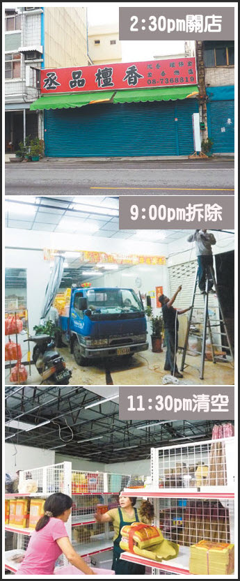 14日晚九點,屏東市下著大雨,這間檀香行內突然傳出巨聲,民眾以為禁不起大雨沖刷倒塌,紛紛出門查看,記者也趕往,發現是十多名工人冒著大雨拆屋。