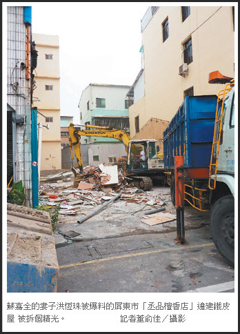 蘇嘉全的妻子洪恆珠農舍風波未息又被爆料,洪在屏東市廣東路有間違建鐵皮屋,租給商家開「丞品檀香行」,且洪未報房屋稅及租賃所得,涉嫌逃漏稅;14日晚上連夜搬貨拆屋,到晚間十一時卅分,天花板已拆掉一半,裡面貨物架幾已清空。工人說「受老闆娘雇用拆屋」,老闆娘是誰?「不知道!」