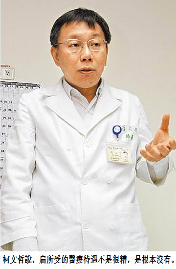 蘋果日報報導,陳水扁自費延醫案獲准,醫師柯文哲、郭正典昨天到北監看診,柯文哲事後受訪表示,基於患者隱私不能透露病情,但扁「所受的醫療待遇不是很糟,是根本沒有」,扁沒有主治醫師,病歷混亂。