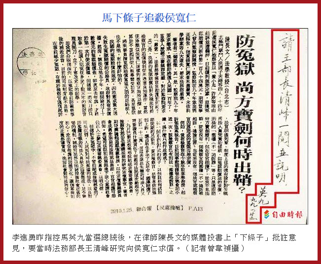 陳長文九十九年一月廿五日投書講太極門,巧合的是,同年二月四日,法務部長王清峰即發函給高檢署,明白寫道馬英九特別費案「筆錄嚴重失實,請查明責任並將懲處結果具報」。侯寬仁指出,法務部在公函中就已定好「嚴重失實」的結論,還指定要看到懲處結果,等於尚未調查就預先設定目標,就是一定要懲處他。