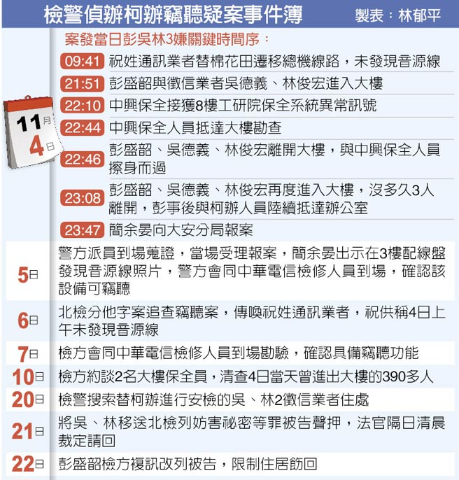 檢警偵辦柯辦遭竊聽案,今天下午傳喚柯辦幕僚彭盛韶,訊後以彭涉嫌妨害秘密罪嫌重大,有逃亡之虞,但無羈押必要,諭令以三萬元交保。然而彭因認為自己並無任何過錯,透過律師表示拒保。北檢晚間再度開庭,訊後改裁無保請回,將彭改為限制住居。