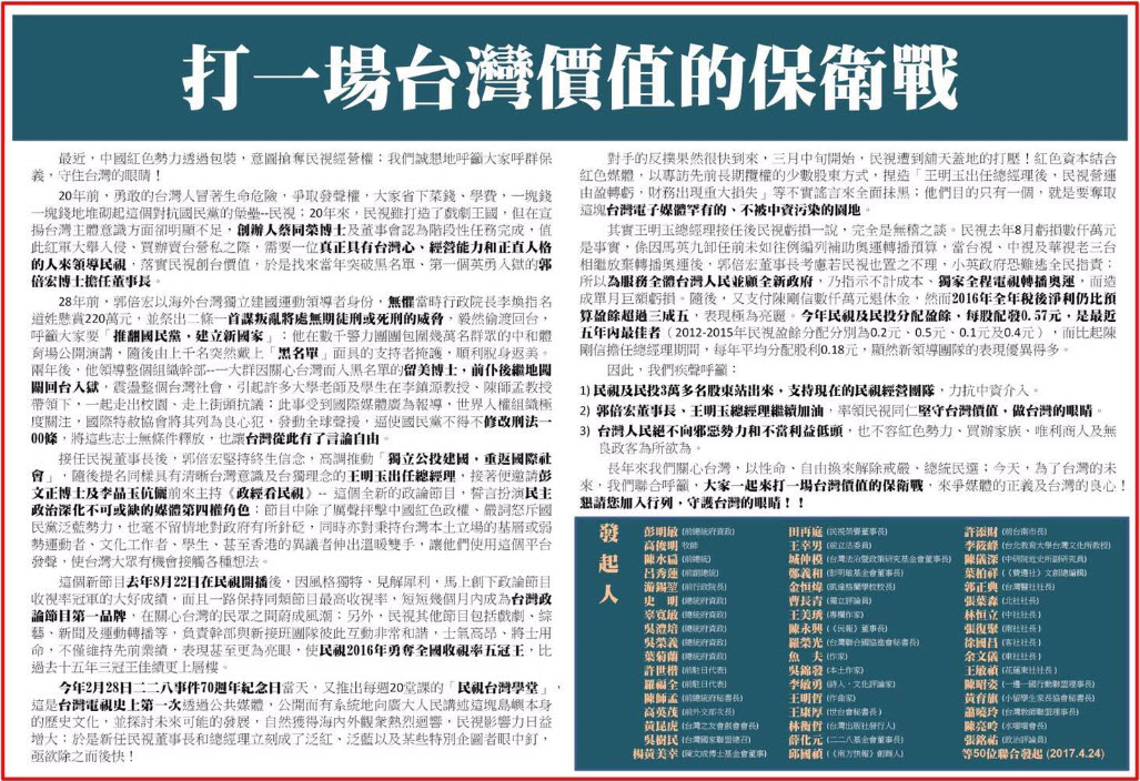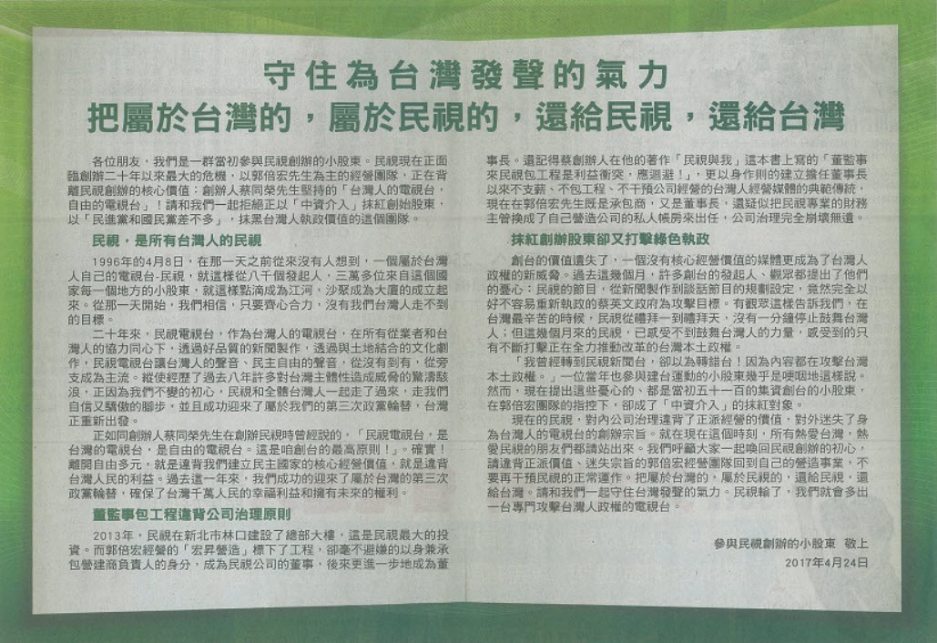 民視經營權之爭已到攤牌的地步,四月二十四日同一天,《自由時報》上發生了激烈的廣告肉搏戰:一方是由五十位綠營中有聲望、有公信力的重量級人士發起,公開呼籲進行「台灣價值的保衛戰」;另一方署名「參與民視創辦的小股東」,以「屬於民視的,還給民視,還給台灣」為號召;雙方都是向佔七成(?)的小股東招手。