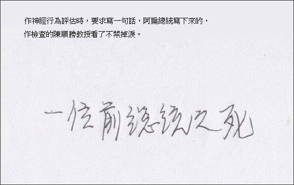 今年二月大選之前,正值吳淑珍夫人母親之喪,阿扁總統自龜山奔喪,在離開靈堂之後,見到在外等候他許久的老母親,阿扁總統緊緊擁抱著她,並且在她耳邊輕聲說安慰她:「阿母,請您放心,阿扁很快就會回家了!」然而,被囚禁在一點三坪牢獄四年而冀望於蔡英文當選的阿扁總統,在得之結果之後,徹底失望了!身心也為之崩潰了!